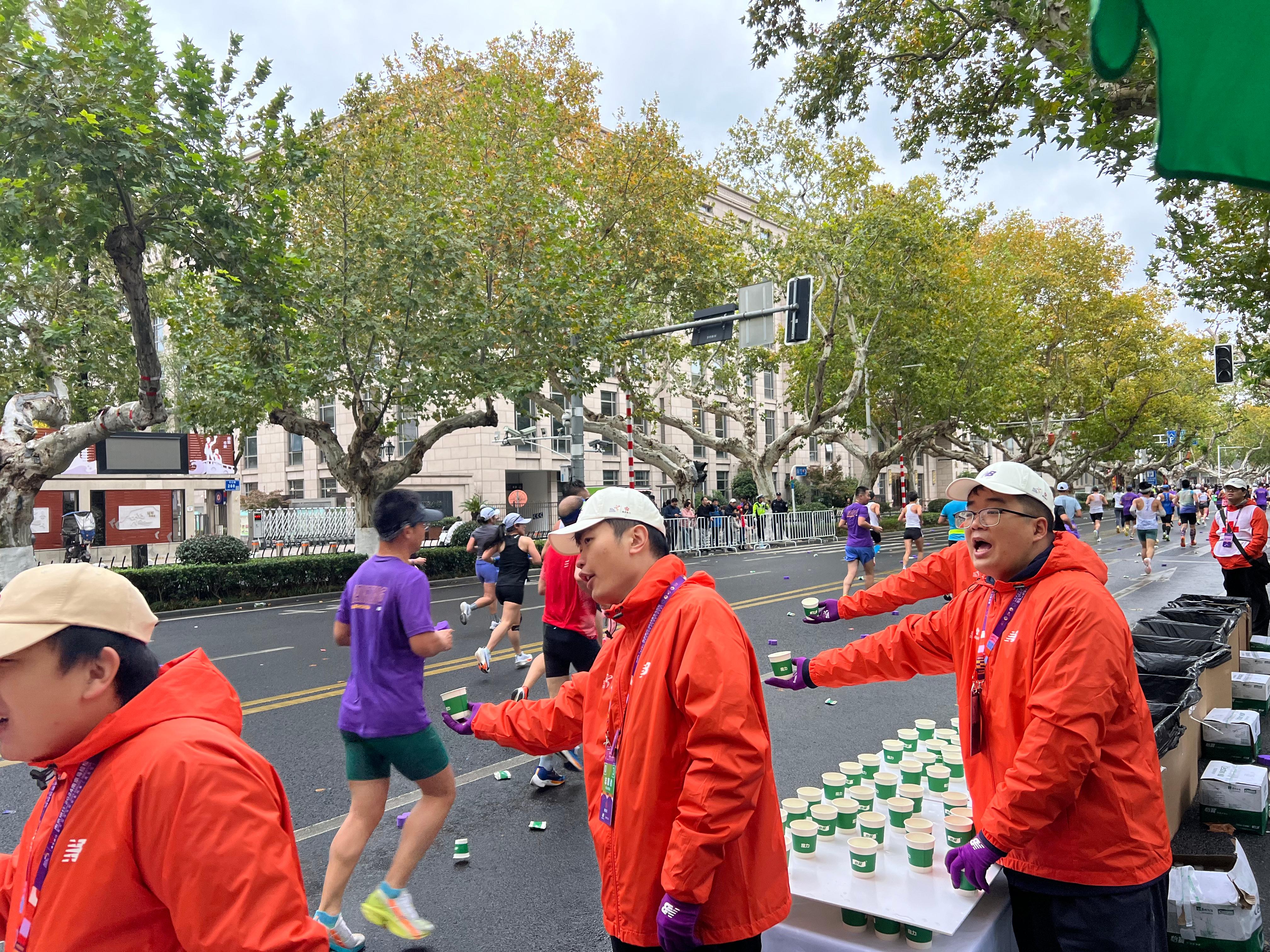 公司青年志愿者的責任點為11km補給點,負責為參賽選手提供飲用水、功能飲料等。比賽當日凌晨5點左右,志愿者們早早來到服務點位,扛桌子、搬飲料、鋪桌布,大家各司其職,井然有序地開始上崗準備工作。賽道上的參賽選手奮勇爭先,賽道旁的志愿者們熱情洋溢。比賽過程中,志愿者們不辭辛勞,忙碌地將一杯杯水、一個個補給品遞送至參賽者手中,并為他們加油打氣。大家以高度負責的態度、飽滿的熱情全身心投入到志愿服務中,充分展現了航天青年昂揚向上的青春風采和精神風貌。不少參賽選手對志愿者們投以微笑,并對他們的貼心服務表示感謝和贊揚。