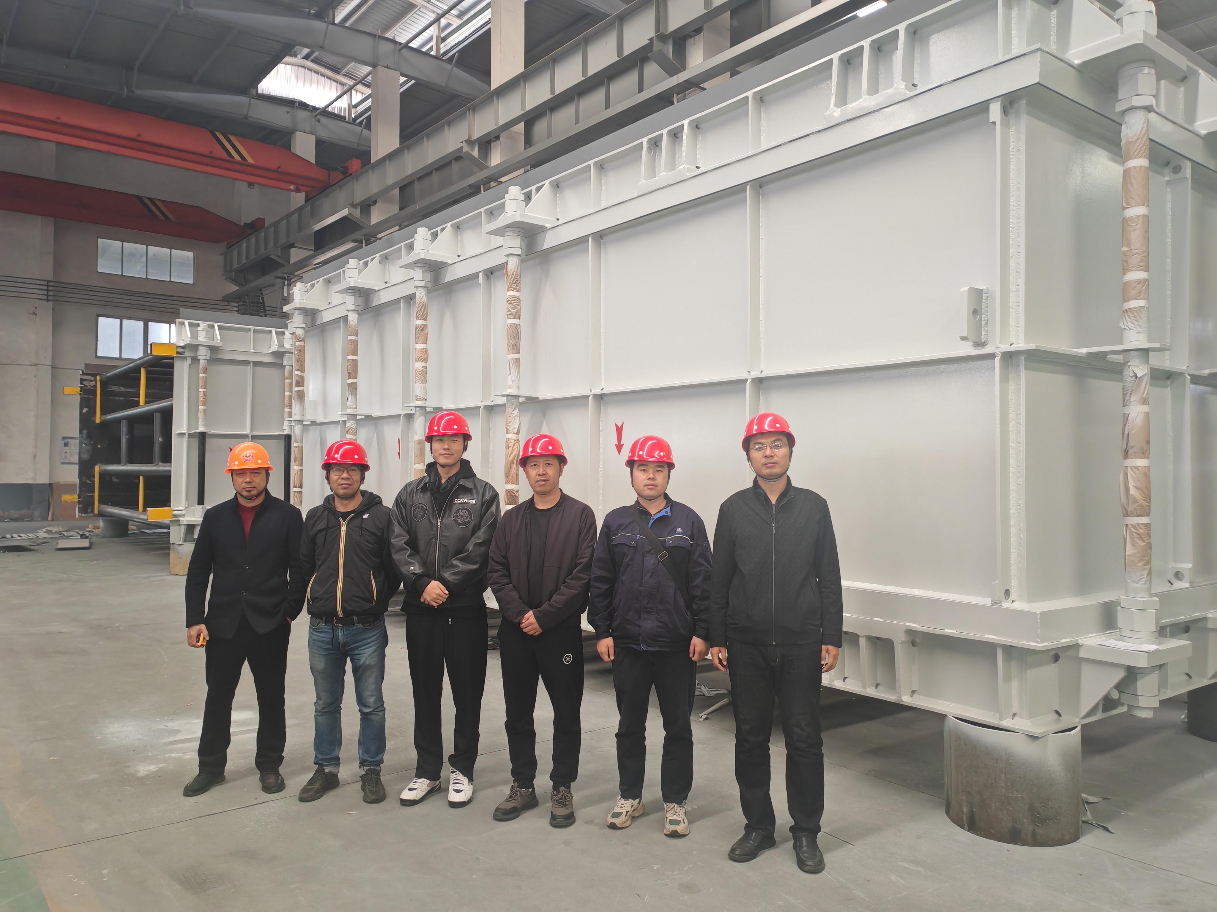 超大型產(chǎn)品對設計、生產(chǎn)、檢驗、運輸、現(xiàn)場組裝過程都提出了更高的要求。在設計過程中,突擊隊吸取問題產(chǎn)品的教訓,采用更適合的產(chǎn)品選型與更加穩(wěn)定的波形結構;對于產(chǎn)品整體的加強與支撐結構,采用有限元仿真進行整體校核;在生產(chǎn)中,為保障大尺寸板材的焊接形變量與焊縫強度,關鍵部位的每一道加工工序、拼接方式都進行嚴格梳理;因為產(chǎn)品的設計要求,如何保證產(chǎn)品分解運輸與組裝后的可靠性成了重中之重,小組成員在分解組裝方案上進行反復討論與修改,確保產(chǎn)品的每一道焊縫質(zhì)量足夠抵抗全真空的工作環(huán)境。面對項目即將完工時的突發(fā)狀況,突擊隊勇于創(chuàng)新、敢于擔當,在大家的通力配合下,項目順利通過了業(yè)主方與SGS項目驗收。