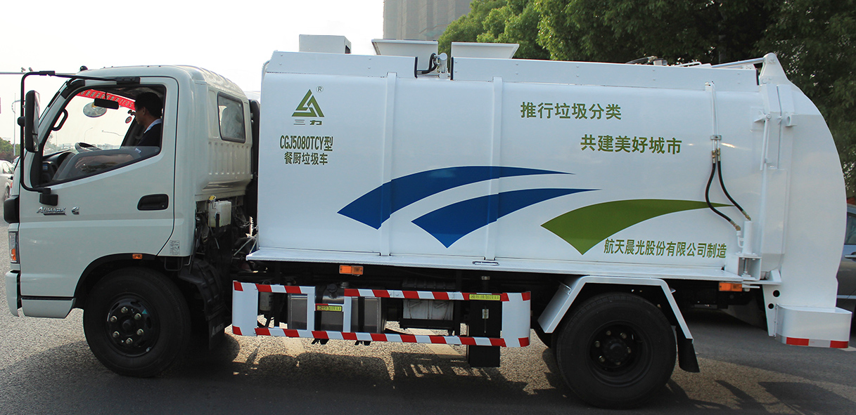 CGJ5080TCAE5/CGJ5080TCY型餐廚垃圾車是對(duì)賓館、餐廳、食堂的廚余垃圾、食品加工的廢料、副食品集貿(mào)市場(chǎng)和超市的過(guò)期商品等直接收運(yùn)的專用車輛。該產(chǎn)品通過(guò)底盤取力器驅(qū)動(dòng)液壓泵,產(chǎn)生高壓油,帶動(dòng)液壓系統(tǒng)工作,從而提桶機(jī)構(gòu)和頂蓋工作,將垃圾桶內(nèi)垃圾倒入箱體;到指定地點(diǎn),打開(kāi)后門,推出推板進(jìn)行卸料,完成作業(yè)。